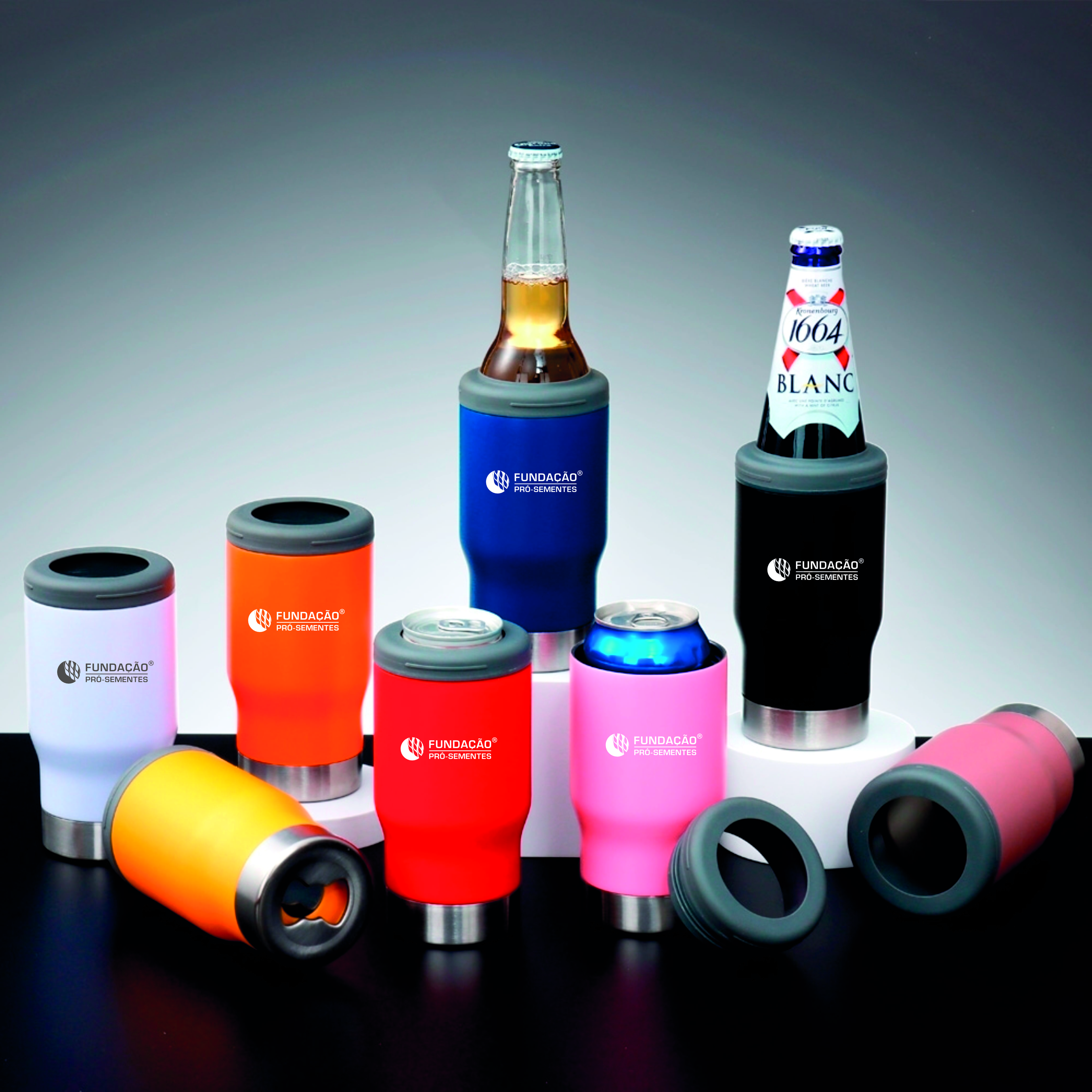 Copo térmico multiuso com parede dupla em inox, capacidade de 380ml. Pode ser utilizado como copo, porta long neck ou porta lata. Contém abridor de garrafa na parte inferior do copo.