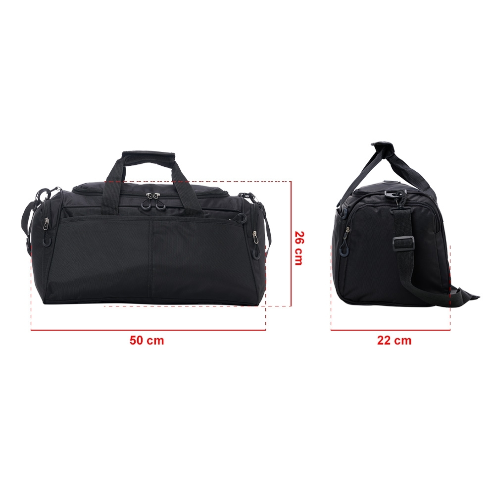 Bolsa de viagem de 28 litros em poliéster oxford resistente à água com quatro compartimentos. Contém alça de mãos com suporte de juntura, bases antiderrapantes e acompanha alça transversal com suporte de apoio para ombro.