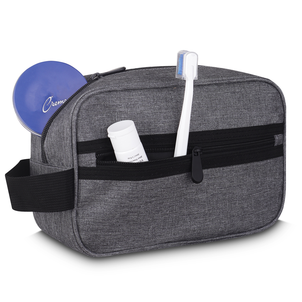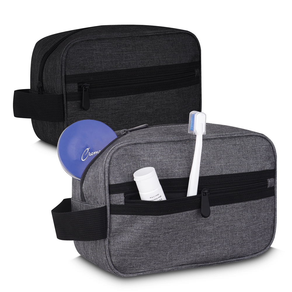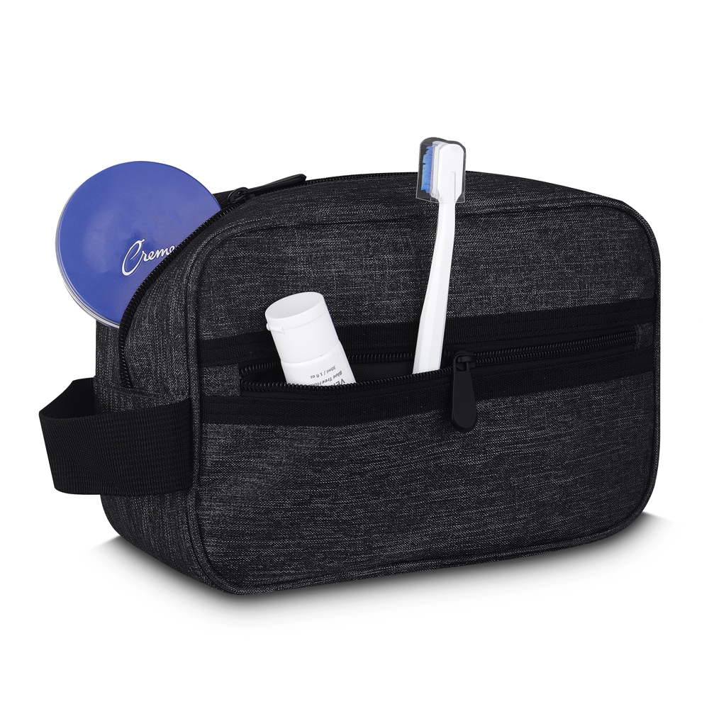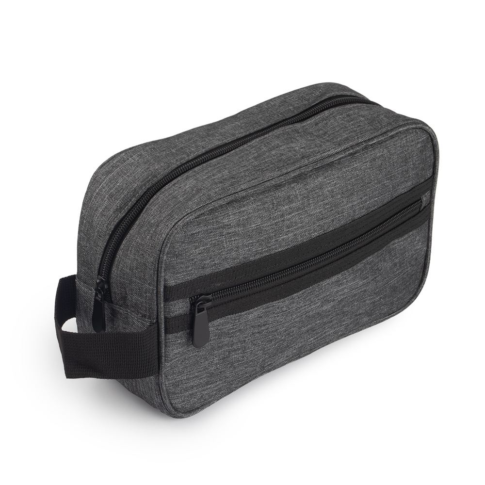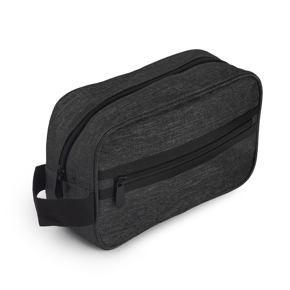 Nécessarie em tecido poliéster 300D, alça de mão e bolso externo com zíper.