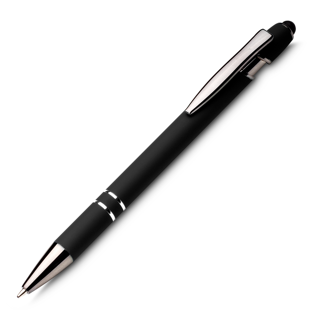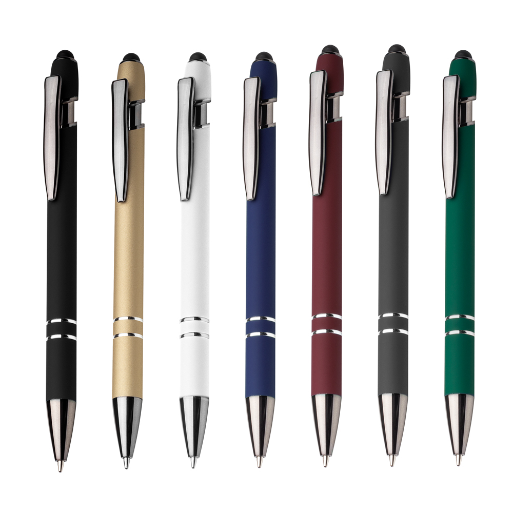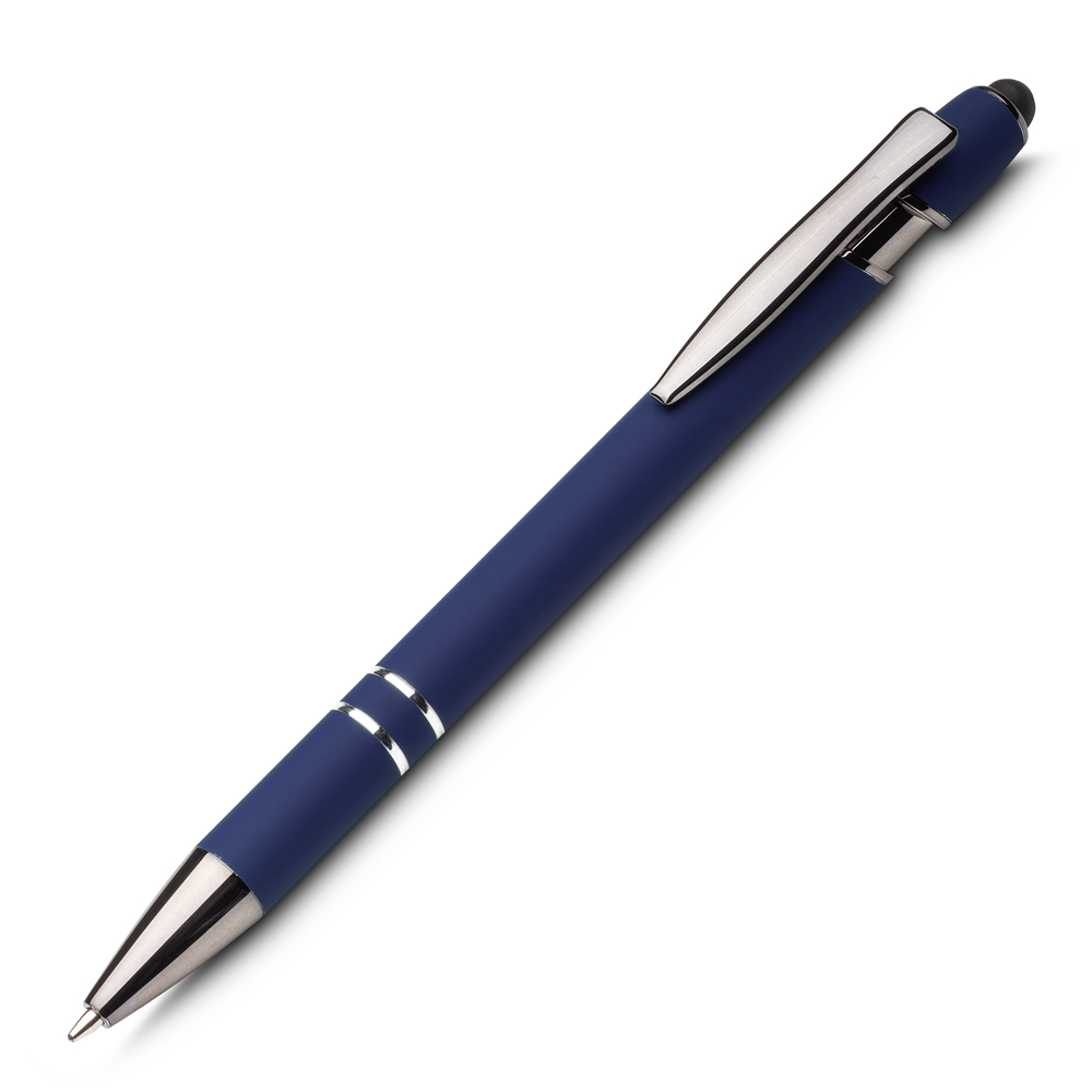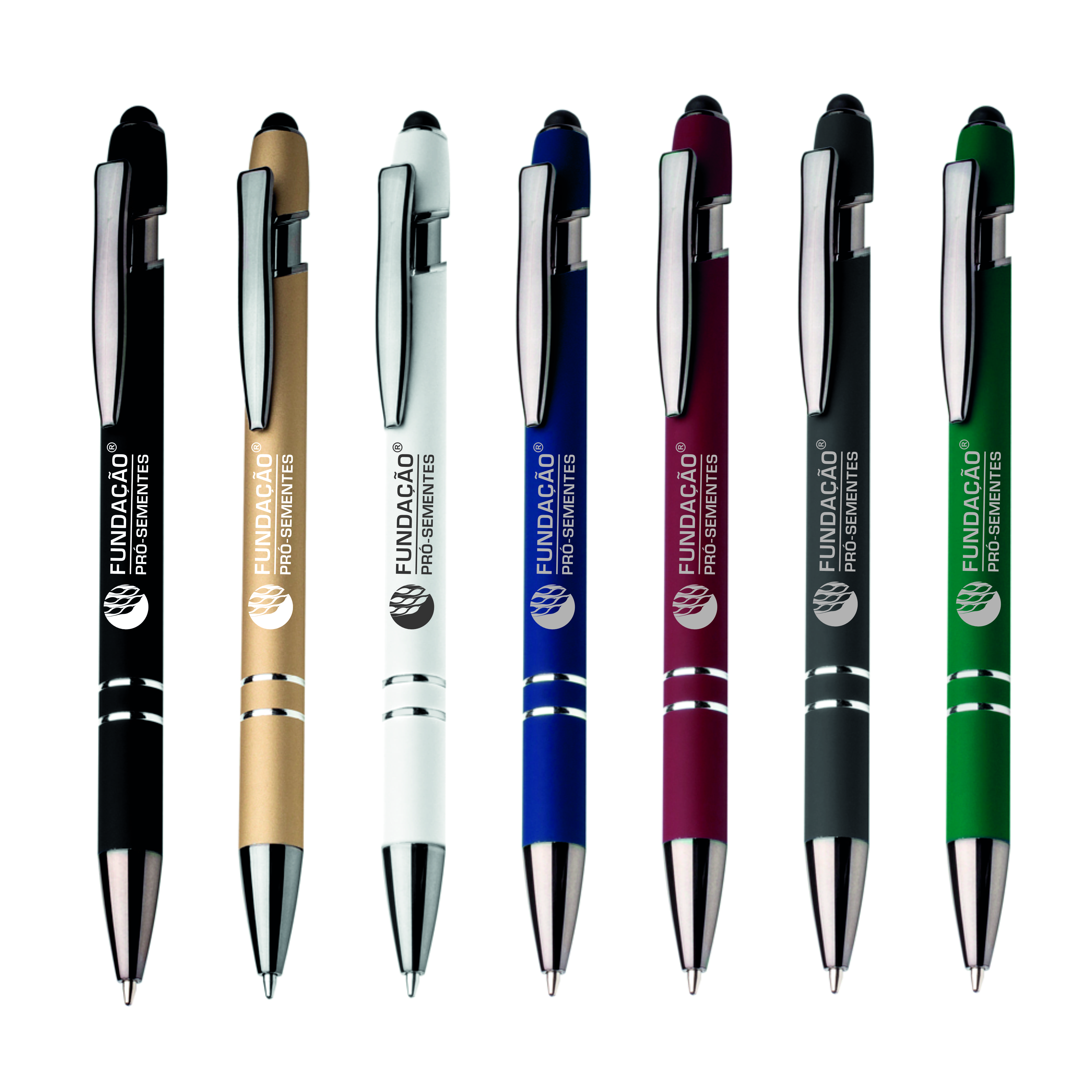 Caneta esferográfica em metal escrita em azul. Refil tipo parker com ponta touch emborrachada.