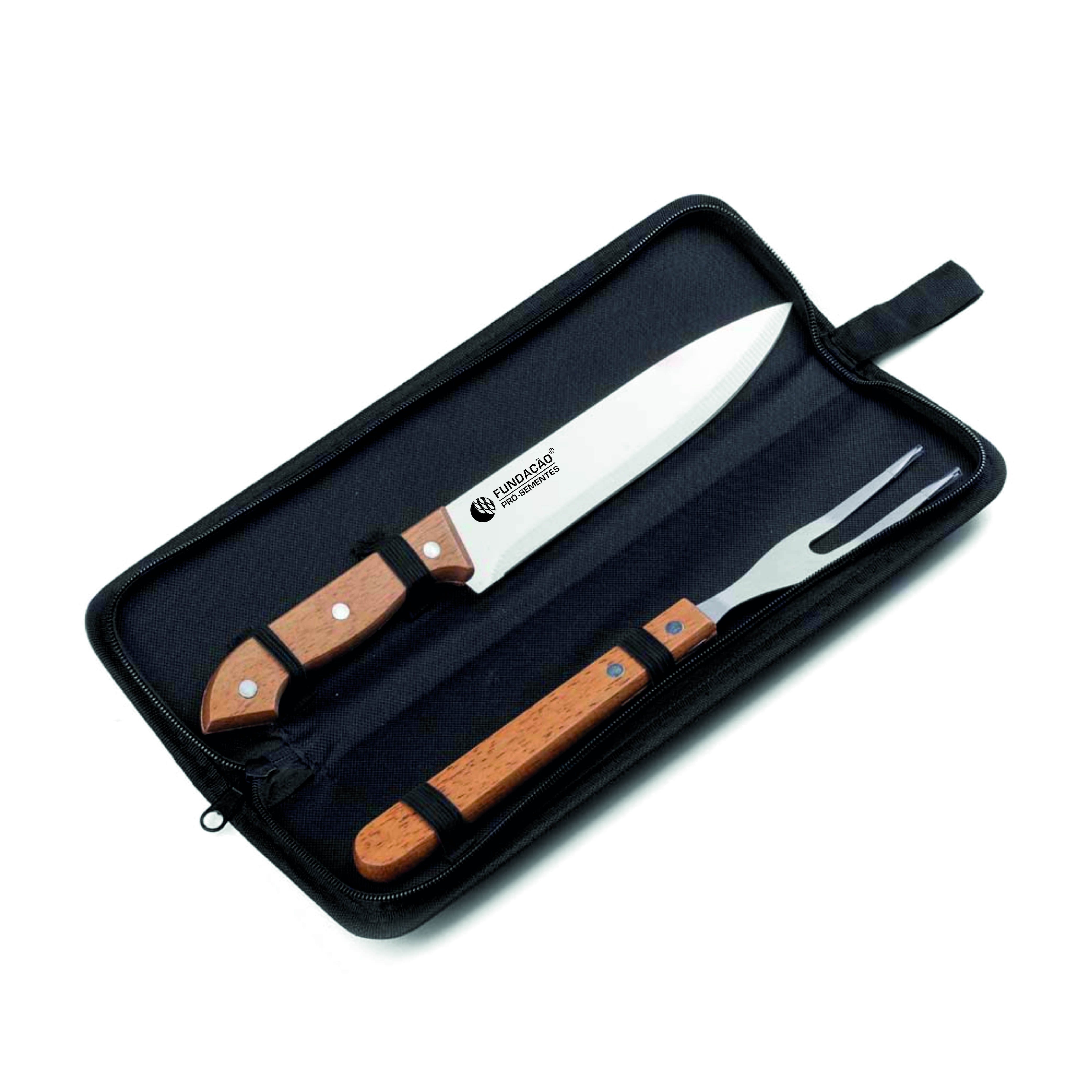 Kit Churrasco contendo 3 peças: Estojo de Nylon com alça para pendurar, uma Faca com 31,7 cm e um Garfo trinchante, ambos com cabos de madeira.