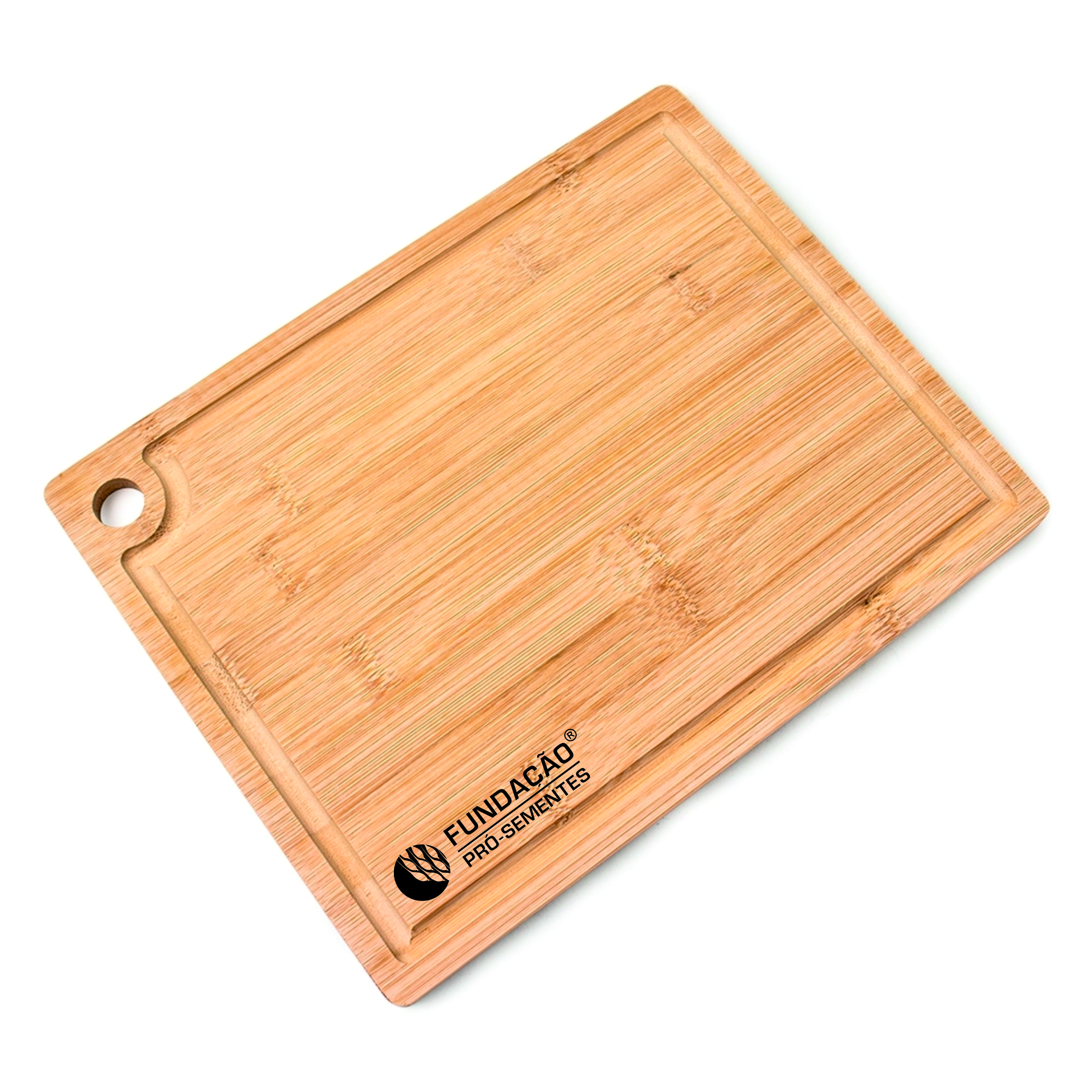 Tábua de corte de bambu com canaleta e acesso para gancho.