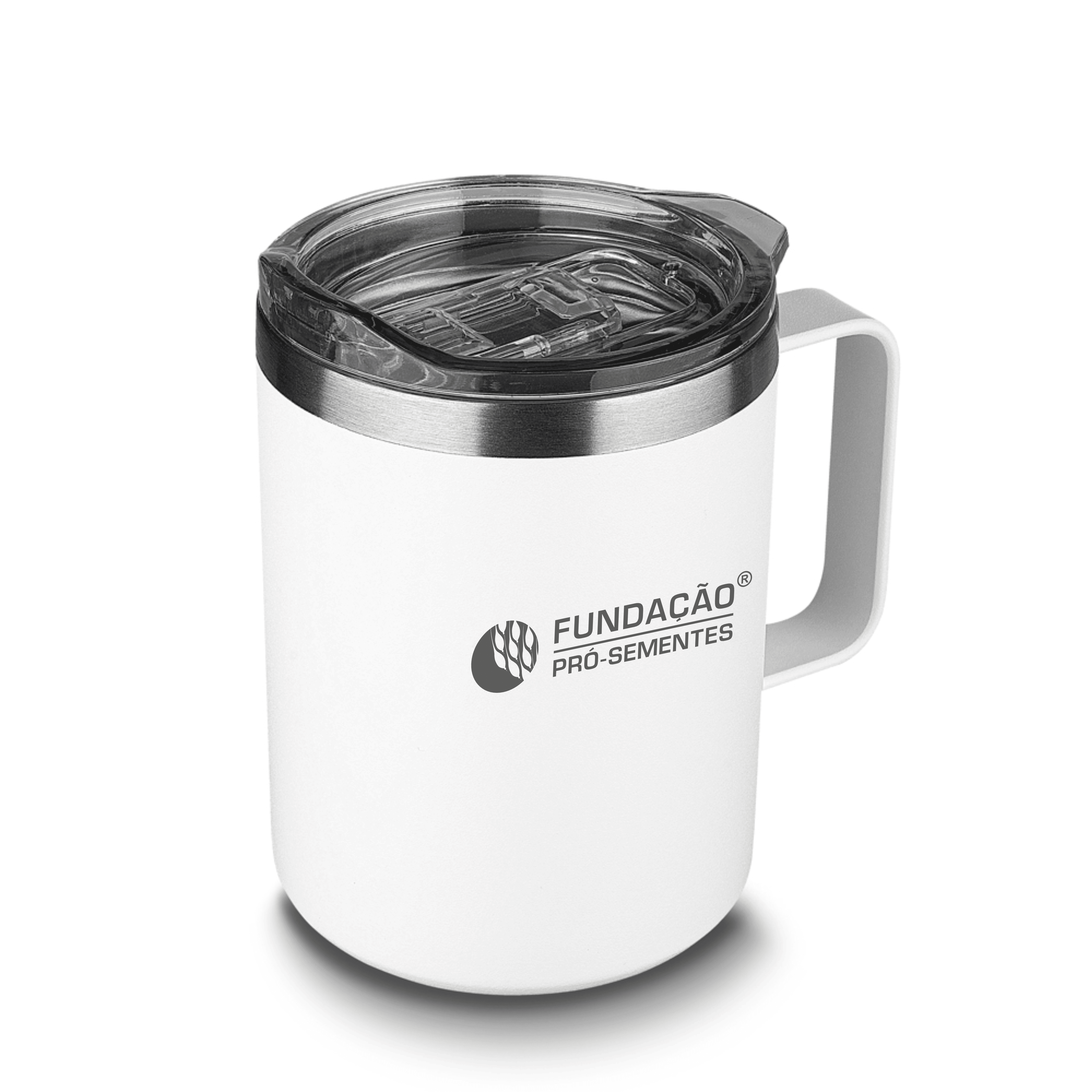 Caneca térmica em aço inox com parede dupla isolada à vácuo, tampa plástica e anel em silicone para vedação, alça lateral. Capacidade 350ml.