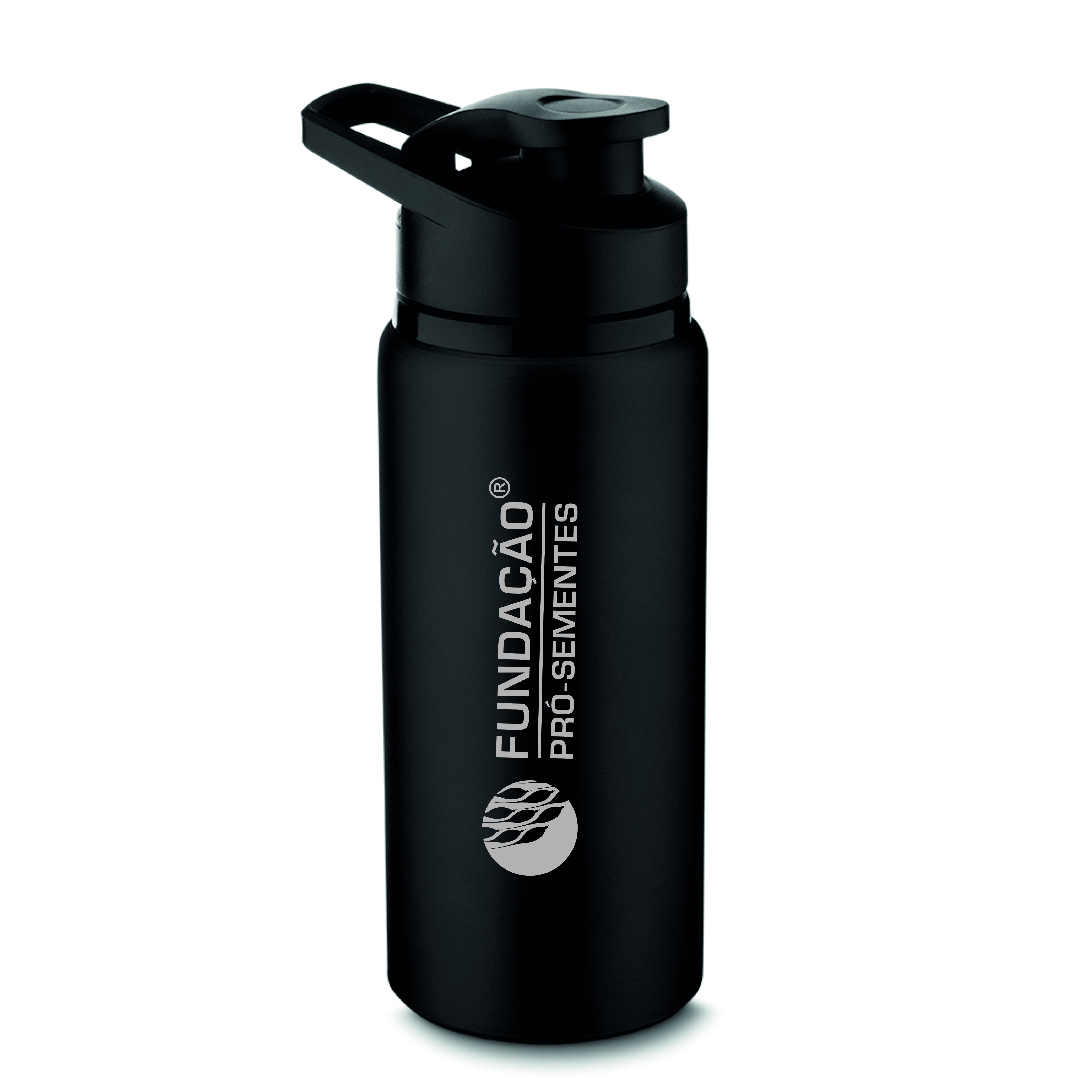 Garrafa de alumínio com capacidade de até 650ml em cores. Tampa rosqueável, bico com tampa vedada de acesso rápido, e alça para transporte.