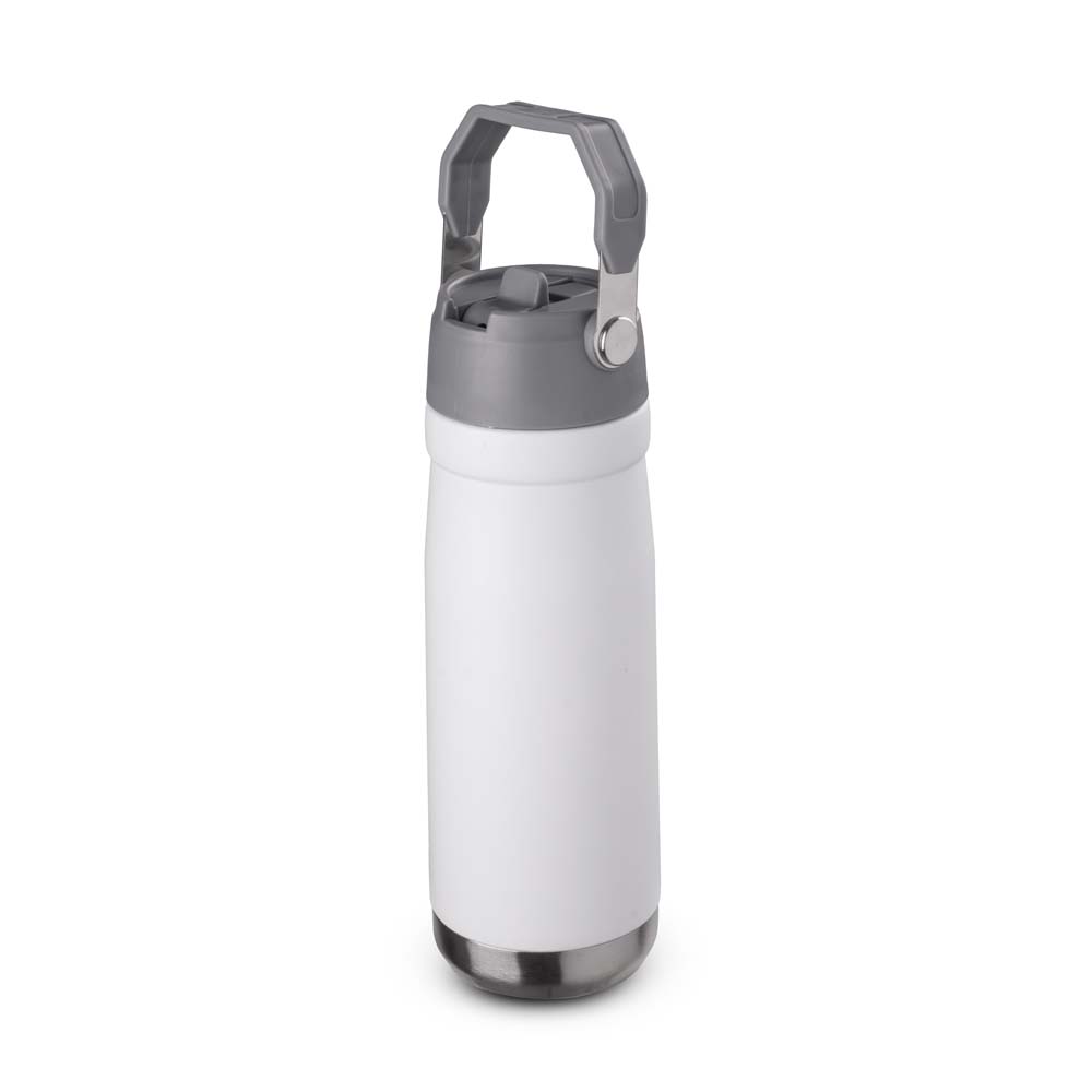 Garrafa térmica em aço inox com parede dupla, com capacidade de 700ml. Tampa rosqueável em plástico, com alça plástica para transporte. Bico por meio de sucção com canudo.