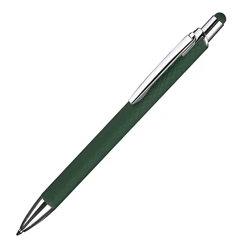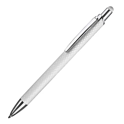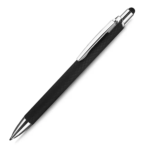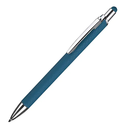Caneta esferográfica em alumínio reciclavel com escrita em azul. Refil tipo parker e ponta touch emborrachada.