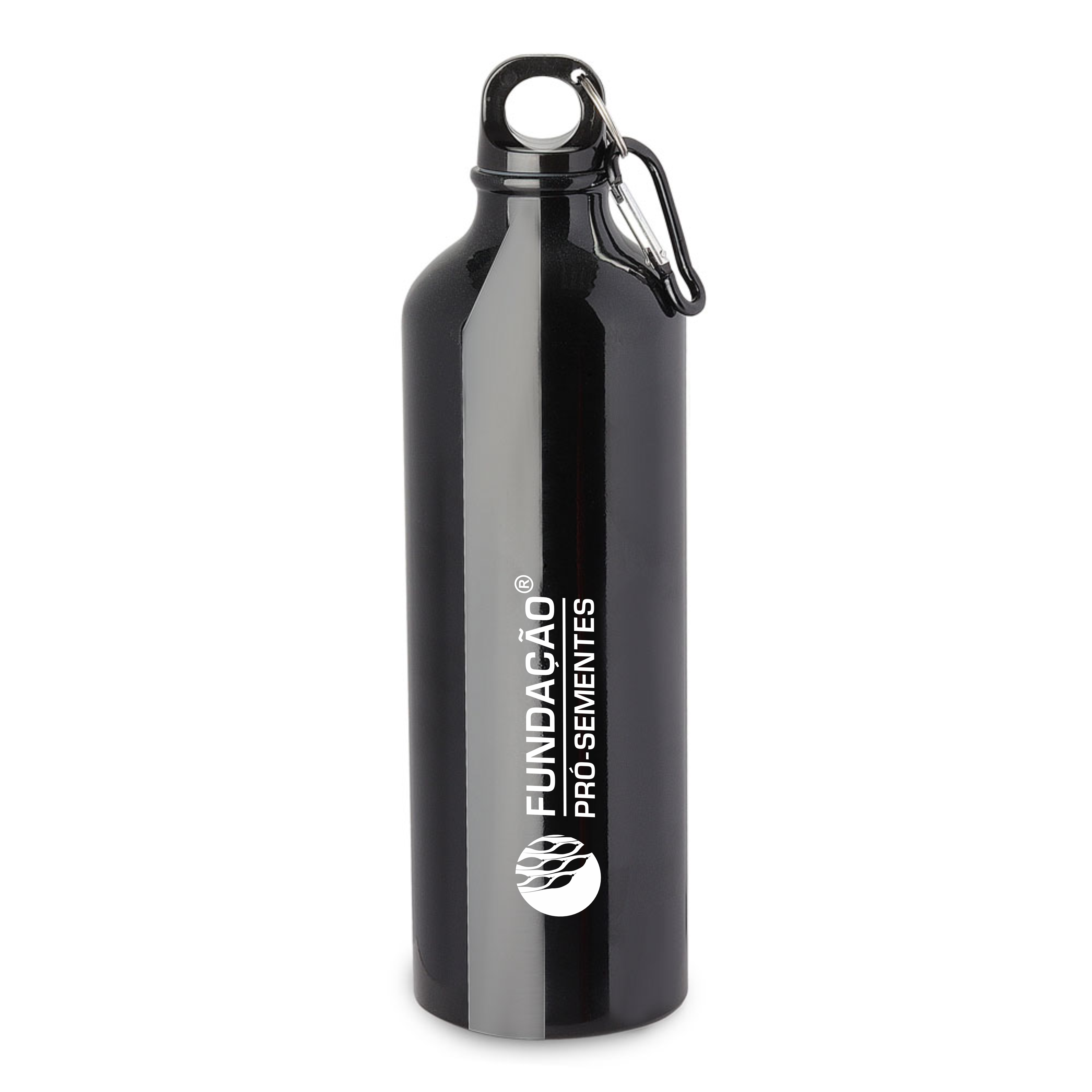 Garrafa em alumínio, tampa de plástico com mosquetão colorido. Capacidade de 750ml, com pintura metálica.