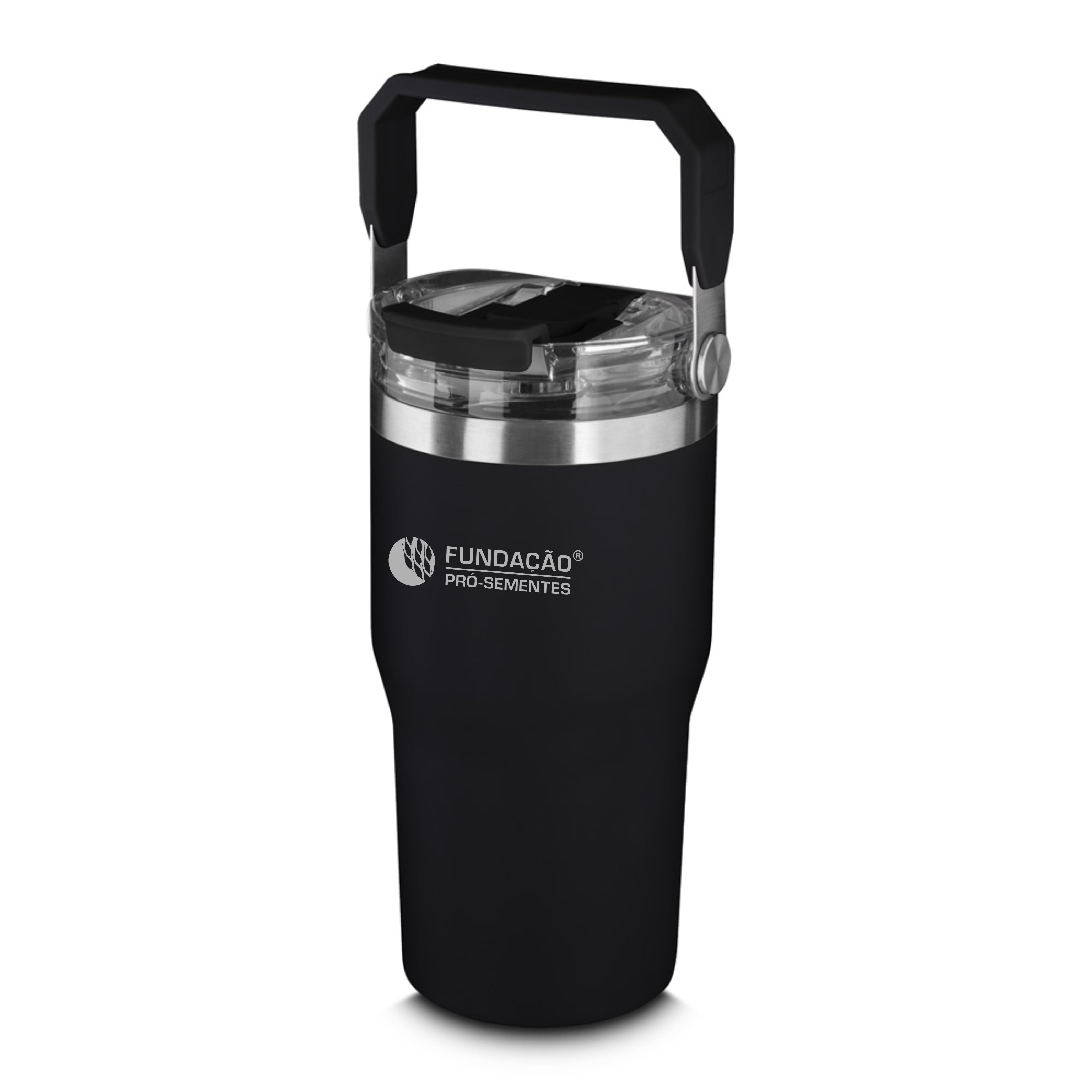 Garrafa térmica em aço inox com parede dupla com capacidade de até 650ml, parede externa com pintura a pó. Tampa rosqueável com anel de silicone para vedação. Alça de transporte em plástico. Permite-se hidratar por canudo ou bico.