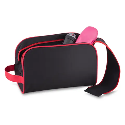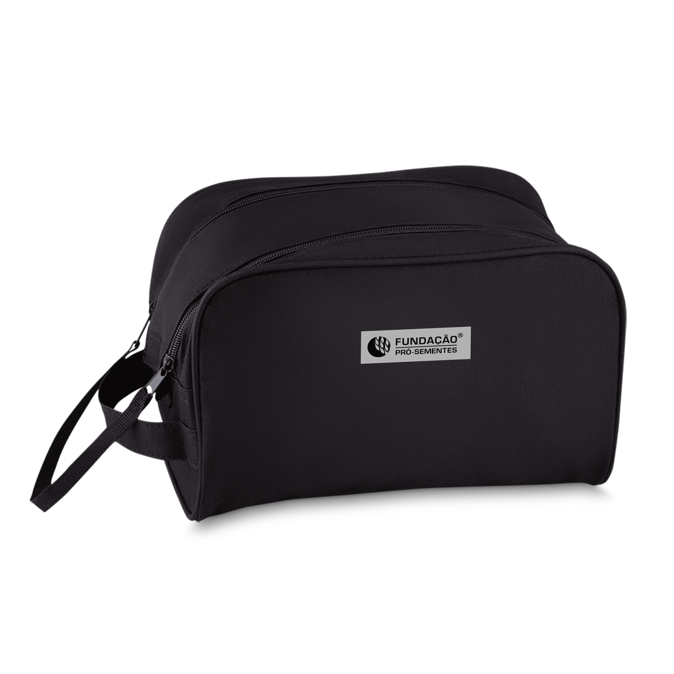 Nécessarie tecido poliéster 600D e detalhe em PVC,cursor duplo para fechamento com alça,trava com velcro,alça de mão,gravação Frontal.