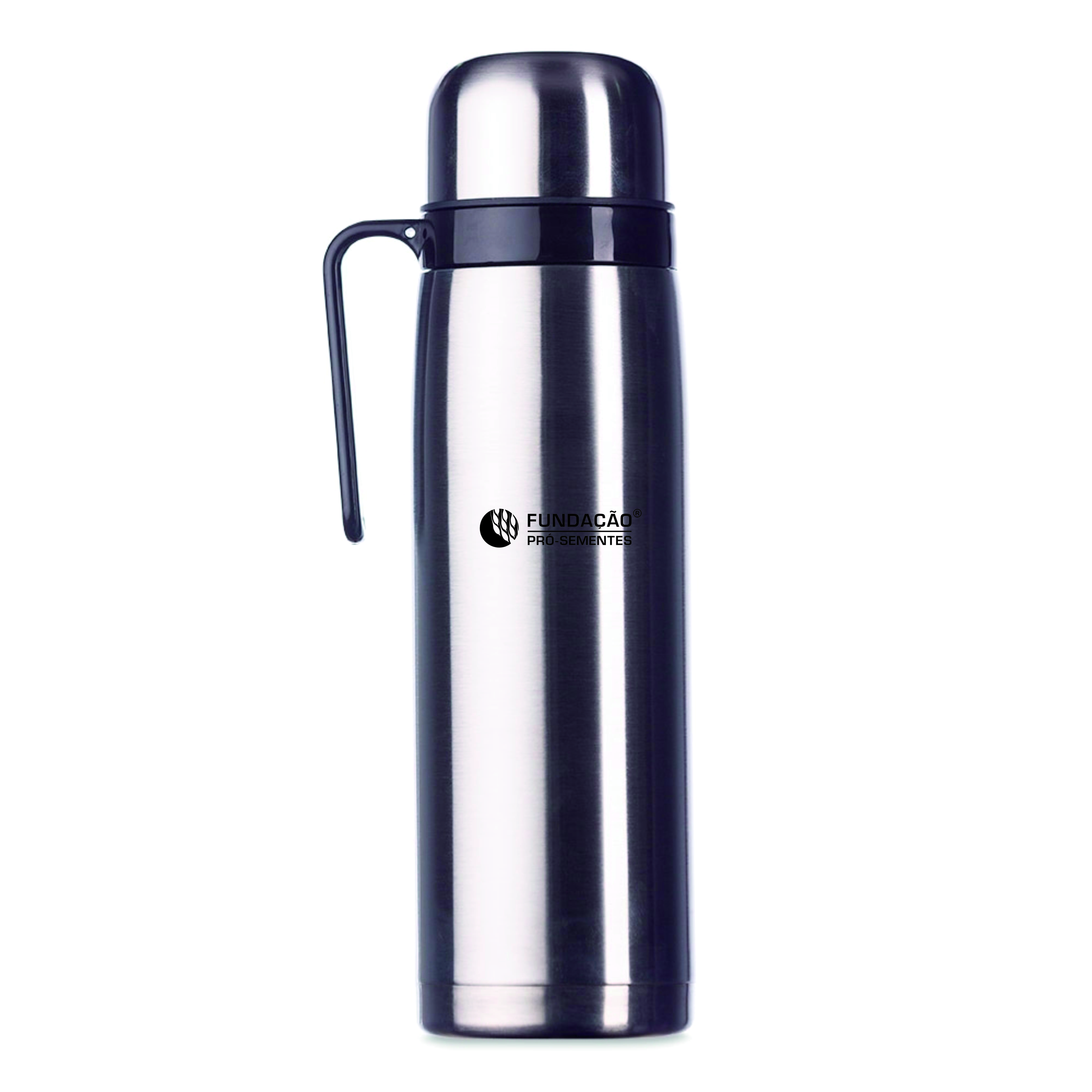 Garrafa térmica 1 litro em inox com alça plástica. Possui tampa rosqueável, tampa interna rosqueável com bico plástico vermelho.