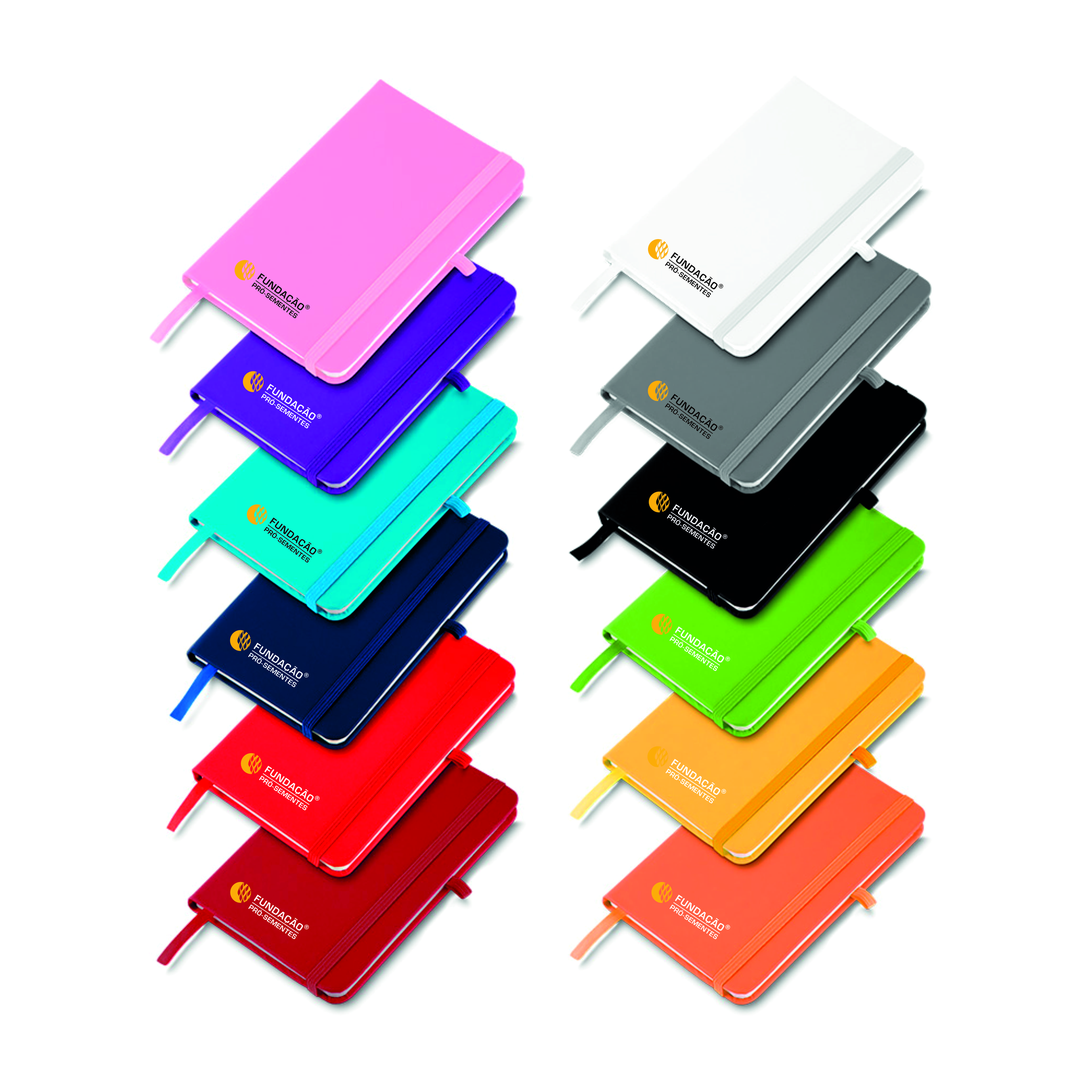Caderno de anotações com elástico no tamanho A5, suporte para caneta, capa dura em material sintético, miolo 80 folhas pautadas na cor bege.